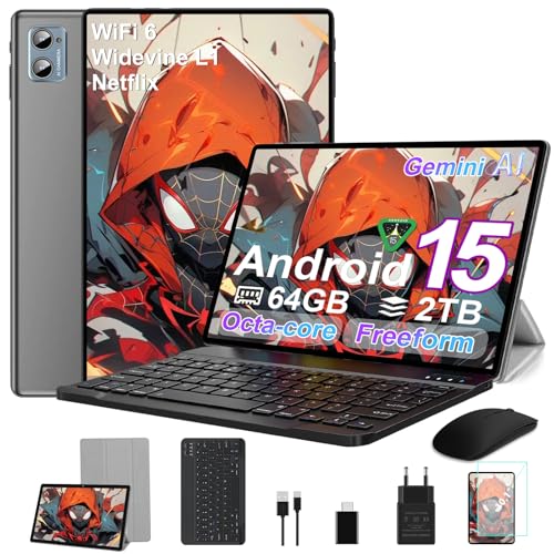 SUAAT Android 15 Tablet 10 Pulgadas, 30GB RAM+2TB TF, Widevine L1,Gemini AI, 6000mAh Batería, Tablet WiFi 6/8MP+5MP/Octa Core/GMS Certified/BT5.0,Incluye ratón + Teclado + Funda Protectora(Gris)